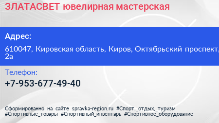 ЗЛАТАСВЕТ, ювелирная мастерская по адресу 610047, Кировская область, Киров, Октябрьский проспект, 2а в дальнейшем Организация, размещена в следующих категориях: