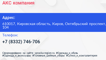 АКС, компания по адресу 610017, Кировская область, Киров, Октябрьский проспект, 104 в дальнейшем Организация, размещена в следующих категориях: