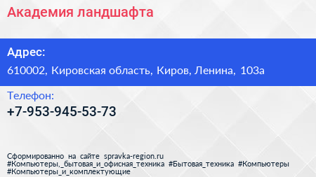Академия ландшафта по адресу 610002, Кировская область, Киров, Ленина, 103а в дальнейшем Организация, размещена в следующих категориях: