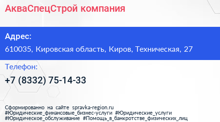 АкваСпецСтрой, компания по адресу 610035, Кировская область, Киров, Техническая, 27 в дальнейшем Организация, размещена в следующих категориях: