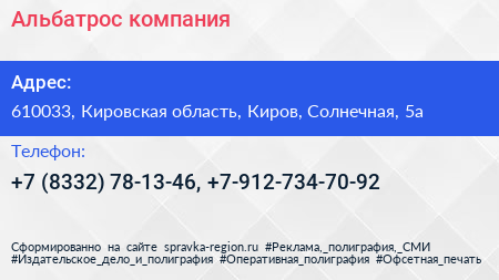 Альбатрос, компания по адресу 610033, Кировская область, Киров, Солнечная, 5а в дальнейшем Организация, размещена в следующих категориях: