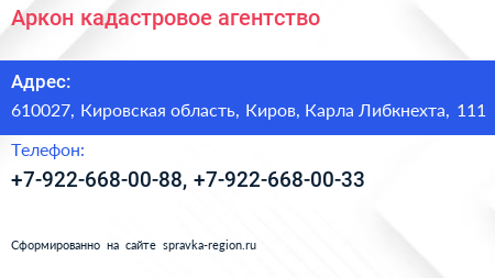 Аркон, кадастровое агентство по адресу 610027, Кировская область, Киров, Карла Либкнехта, 111 в дальнейшем Организация, размещена в следующих категориях: