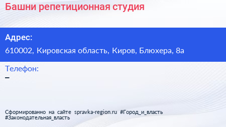 Башни, репетиционная студия по адресу 610002, Кировская область, Киров, Блюхера, 8а в дальнейшем Организация, размещена в следующих категориях:
