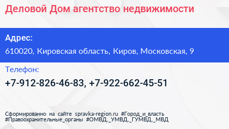 Деловой Дом, агентство недвижимости по адресу 610020, Кировская область, Киров, Московская, 9 в дальнейшем Организация, размещена в следующих категориях: