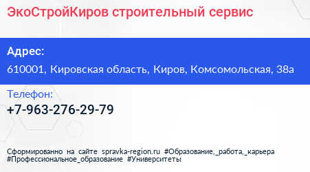 ЭкоСтройКиров, строительный сервис по адресу 610001, Кировская область, Киров, Комсомольская, 38а в дальнейшем Организация, размещена в следующих категориях: