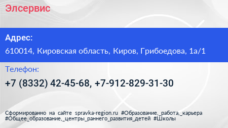 Элсервис по адресу 610014, Кировская область, Киров, Грибоедова, 1а/1 в дальнейшем Организация, размещена в следующих категориях:
