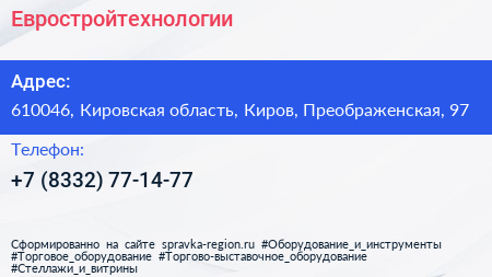 Евростройтехнологии по адресу 610046, Кировская область, Киров, Преображенская, 97 в дальнейшем Организация, размещена в следующих категориях:
