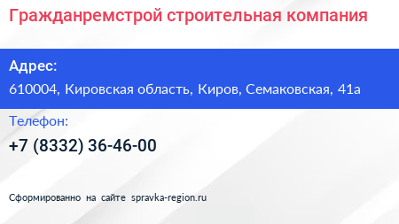 Гражданремстрой, строительная компания по адресу 610004, Кировская область, Киров, Семаковская, 41а в дальнейшем Организация, размещена в следующих категориях: