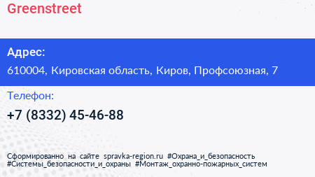 Greenstreet по адресу 610004, Кировская область, Киров, Профсоюзная, 7 в дальнейшем Организация, размещена в следующих категориях:
