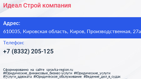 Идеал Строй, компания по адресу 610035, Кировская область, Киров, Производственная, 27а в дальнейшем Организация, размещена в следующих категориях: