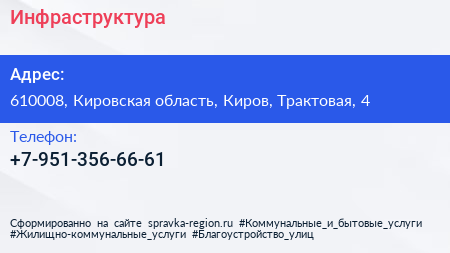 Инфраструктура по адресу 610008, Кировская область, Киров, Трактовая, 4 в дальнейшем Организация, размещена в следующих категориях: