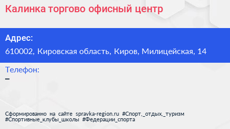 Калинка, торгово-офисный центр по адресу 610002, Кировская область, Киров, Милицейская, 14 в дальнейшем Организация, размещена в следующих категориях:
