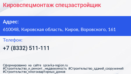 Кировспецмонтаж, спецзастройщик по адресу 610048, Кировская область, Киров, Воровского, 161 в дальнейшем Организация, размещена в следующих категориях: