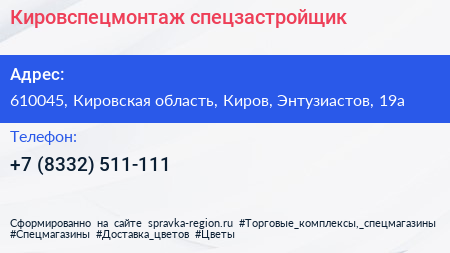 Кировспецмонтаж, спецзастройщик по адресу 610045, Кировская область, Киров, Энтузиастов, 19а в дальнейшем Организация, размещена в следующих категориях: