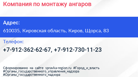 Компания по монтажу ангаров по адресу 610035, Кировская область, Киров, Щорса, 83 в дальнейшем Организация, размещена в следующих категориях: