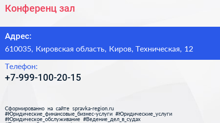 Конференц-зал по адресу 610035, Кировская область, Киров, Техническая, 12 в дальнейшем Организация, размещена в следующих категориях: