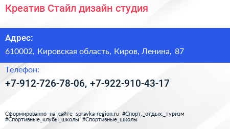 Креатив Стайл, дизайн-студия по адресу 610002, Кировская область, Киров, Ленина, 87 в дальнейшем Организация, размещена в следующих категориях: