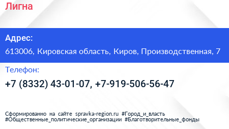 Лигна по адресу 613006, Кировская область, Киров, Производственная, 7 в дальнейшем Организация, размещена в следующих категориях:
