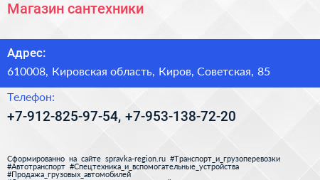 Магазин сантехники по адресу 610008, Кировская область, Киров, Советская, 85 в дальнейшем Организация, размещена в следующих категориях: