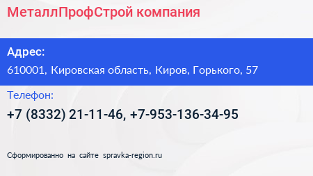 МеталлПрофСтрой, компания по адресу 610001, Кировская область, Киров, Горького, 57 в дальнейшем Организация, размещена в следующих категориях: