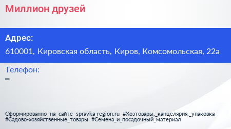 Миллион друзей по адресу 610001, Кировская область, Киров, Комсомольская, 22а в дальнейшем Организация, размещена в следующих категориях: