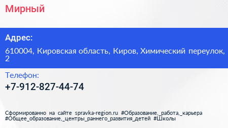 Мирный по адресу 610004, Кировская область, Киров, Химический переулок, 2 в дальнейшем Организация, размещена в следующих категориях: