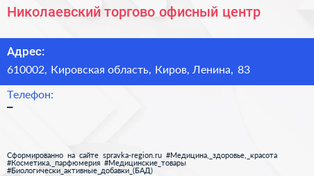 Николаевский, торгово-офисный центр по адресу 610002, Кировская область, Киров, Ленина, 83 в дальнейшем Организация, размещена в следующих категориях: