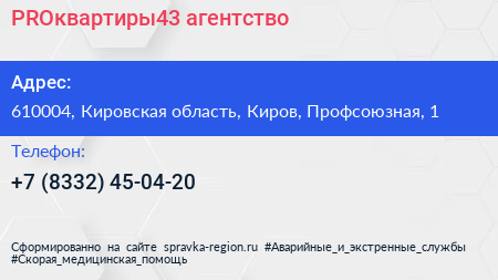 PROквартиры43, агентство по адресу 610004, Кировская область, Киров, Профсоюзная, 1 в дальнейшем Организация, размещена в следующих категориях:
