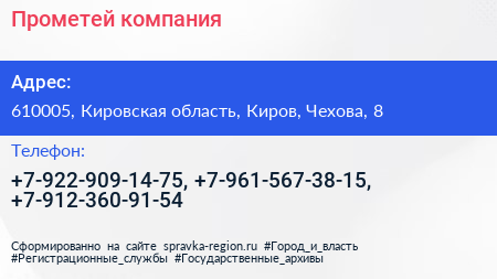Прометей, компания по адресу 610005, Кировская область, Киров, Чехова, 8 в дальнейшем Организация, размещена в следующих категориях: