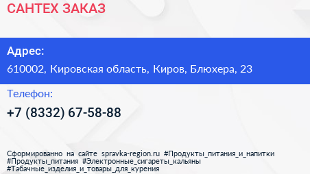 САНТЕХ-ЗАКАЗ по адресу 610002, Кировская область, Киров, Блюхера, 23 в дальнейшем Организация, размещена в следующих категориях: