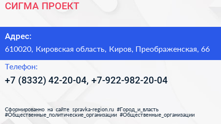 СИГМА-ПРОЕКТ по адресу 610020, Кировская область, Киров, Преображенская, 66 в дальнейшем Организация, размещена в следующих категориях: