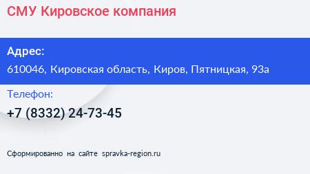 СМУ Кировское, компания по адресу 610046, Кировская область, Киров, Пятницкая, 93а в дальнейшем Организация, размещена в следующих категориях: