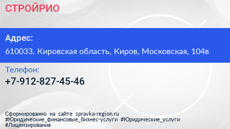 СТРОЙРИО по адресу 610033, Кировская область, Киров, Московская, 104в в дальнейшем Организация, размещена в следующих категориях: