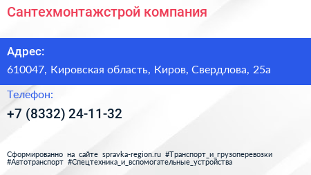 Сантехмонтажстрой, компания по адресу 610047, Кировская область, Киров, Свердлова, 25а в дальнейшем Организация, размещена в следующих категориях: