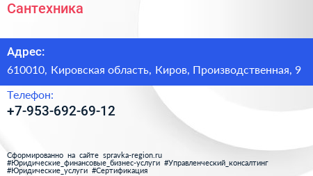 Сантехника по адресу 610010, Кировская область, Киров, Производственная, 9 в дальнейшем Организация, размещена в следующих категориях: