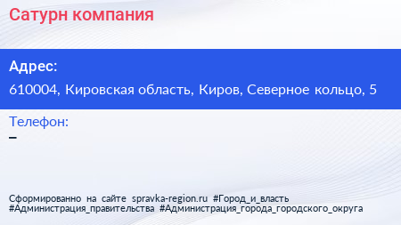 Сатурн, компания по адресу 610004, Кировская область, Киров, Северное кольцо, 5 в дальнейшем Организация, размещена в следующих категориях: