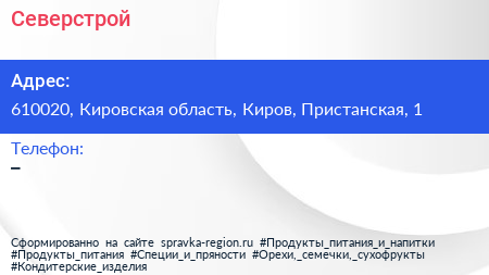 Северстрой по адресу 610020, Кировская область, Киров, Пристанская, 1 в дальнейшем Организация, размещена в следующих категориях: