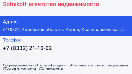 Sotnikoff, агентство недвижимости по адресу 610002, Кировская область, Киров, Красноармейская, 5 в дальнейшем Организация, размещена в следующих категориях: