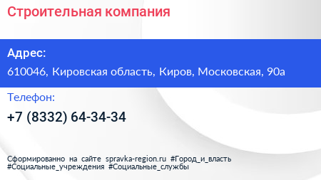Строительная компания по адресу 610046, Кировская область, Киров, Московская, 90а в дальнейшем Организация, размещена в следующих категориях: