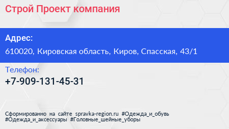 Строй-Проект, компания по адресу 610020, Кировская область, Киров, Спасская, 43/1 в дальнейшем Организация, размещена в следующих категориях: