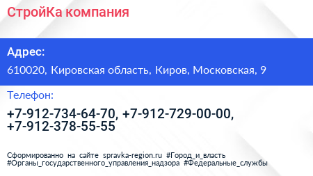 СтройКа, компания по адресу 610020, Кировская область, Киров, Московская, 9 в дальнейшем Организация, размещена в следующих категориях:
