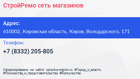 СтройРемо, сеть магазинов по адресу 610002, Кировская область, Киров, Володарского, 171 в дальнейшем Организация, размещена в следующих категориях: