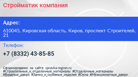 Стройматик, компания по адресу 610045, Кировская область, Киров, проспект Строителей, 21 в дальнейшем Организация, размещена в следующих категориях:
