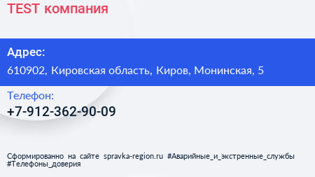 TEST, компания по адресу 610902, Кировская область, Киров, Монинская, 5 в дальнейшем Организация, размещена в следующих категориях: