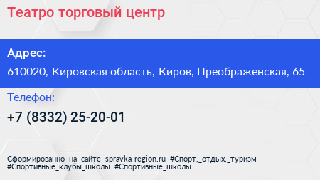 Театро, торговый центр по адресу 610020, Кировская область, Киров, Преображенская, 65 в дальнейшем Организация, размещена в следующих категориях: