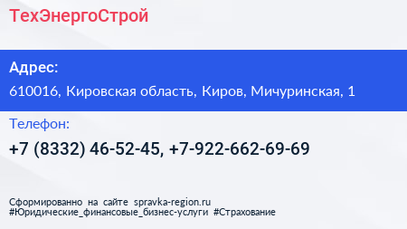 ТехЭнергоСтрой по адресу 610016, Кировская область, Киров, Мичуринская, 1 в дальнейшем Организация, размещена в следующих категориях: