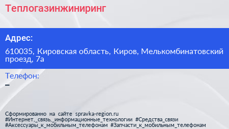 Теплогазинжиниринг по адресу 610035, Кировская область, Киров, Мелькомбинатовский проезд, 7а в дальнейшем Организация, размещена в следующих категориях: