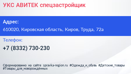 УКС АВИТЕК, спецзастройщик по адресу 610020, Кировская область, Киров, Труда, 72а в дальнейшем Организация, размещена в следующих категориях: