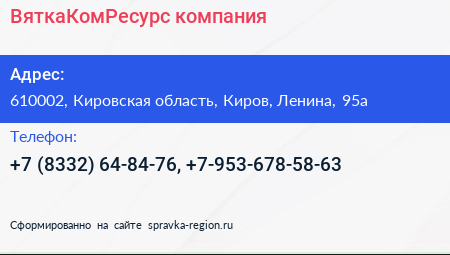 ВяткаКомРесурс, компания по адресу 610002, Кировская область, Киров, Ленина, 95а в дальнейшем Организация, размещена в следующих категориях: