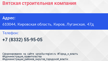 Вятская строительная компания по адресу 610044, Кировская область, Киров, Луганская, 47д в дальнейшем Организация, размещена в следующих категориях: